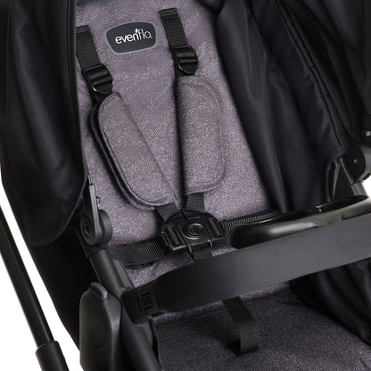 The Evenflo® Pivot® Modular Travel System is the multipurpose stroller you’ve been searching for! This exceptional pramette, stroller and car seat combo is a durable travel system that includes the LiteMax™ Infant Car Seat. The modular frame can be configured with up to 6 modes of use, allowing your child to be parent-facing or forward-facing. The stroller also offers multiple configurations, including pramette mode, toddler mode, or a frame stroller with infant car seat. For comfort, pramette mode allows your baby to fully recline and stretch out. The toddler seat has a maximum weight of 50 lb (22.6 kg), with height recommendations of up to 38 in. (96 cm), while the car seat has a maximum weight of 30 lb (13.6 kg) and a maximum height of 32 in. (81 cm). The LiteMax Infant Car Seat is not only comfortable with a removable body pillow, but features a stay-in-car base that allows for a quick and easy infant car seat connection. Our integrated belt lock-off system provides peace of mind that the base has been securely installed. The feature-rich stroller includes cruiser tires to make it easy to navigate over multiple surfaces, a large canopy with a peek-a-boo window, an oversized storage basket, a removable bumper bar with cup holder and snack tray, and a convenient self-standing fold.